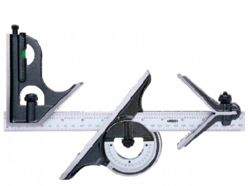 Az Insize kombinált derékszög egy illeszthető fej segítségével a rozsdamentes acélvonalzóhoz, különböző méréseket lehetővé tesz a munkadarabon.