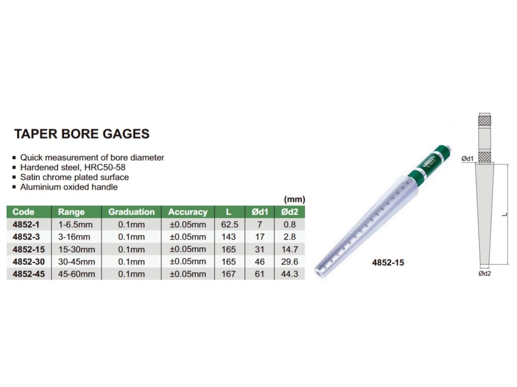 Az Insize furat mérőék a furatátmérők gyors mérésére alkalmas és szatén krómozott, HR50-58 edzett acélból készült.