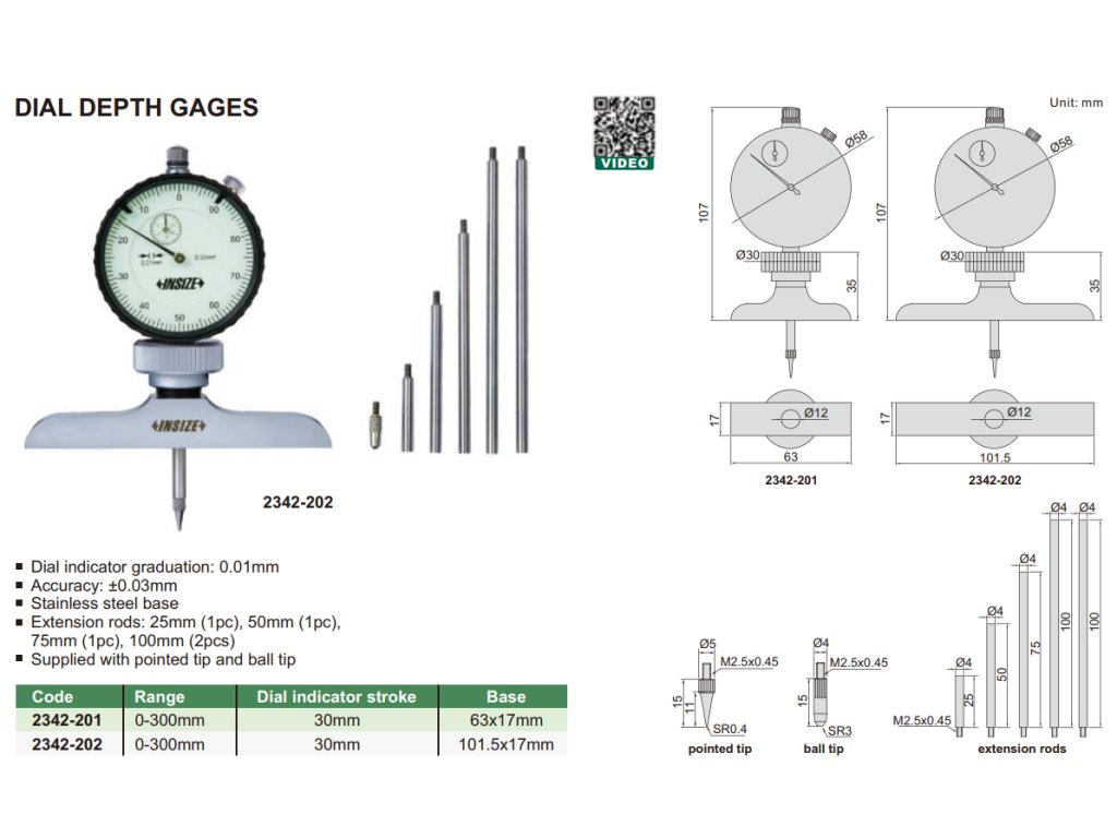 Az Insize analóg mérőórás mélységmérő 5 hosszabbító rúddal 0-300 mm tartományú, 0.01 mm osztással és rozsdamentes acélból készült talppal rendelkezik.
