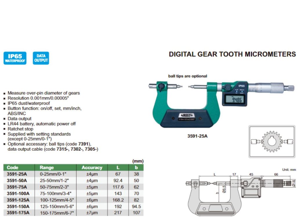Az Insize digitális fogaskerékmérő külső mikrométer cserélhető gömb betéttel 0-25 mm tartományú, 0.001 felbontással és racsnis stoppal rendelkezik.