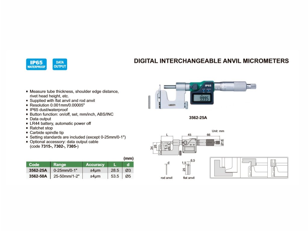 Az Insize digitális speciális mikrométer cserélhető ülékkel a szegecsfej magasság mérésére alkalmas. 25-50 mm tartományú, 0.001 mm felbontással, racsnis stoppal és keményfém mérőorsóval rendelkezik.