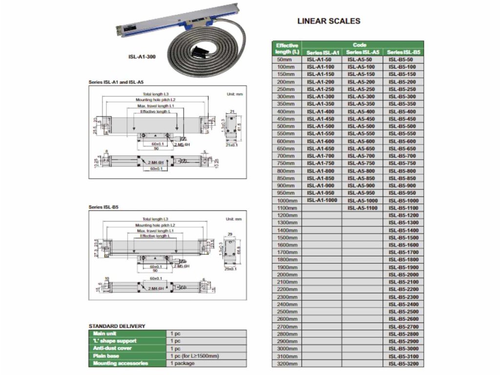 Az Insize lineáris mérőléc szállítmány tartalma: fő egység, "L" alakú tartó, porvédő, lapos alap és szerelési kiegészítők.